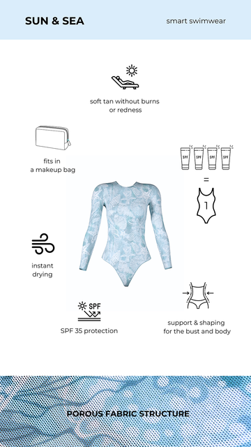 We create smart swimwear that allows a controlled level of ultraviolet light to pass through thanks to a special microporous fabric. It provides an effect similar to SPF-35, giving you an even tan without white marks and reducing the need for creams with chemical filters. Our collections are made in Ukraine using premium European fabrics, part of which are produced from recycled polyester.