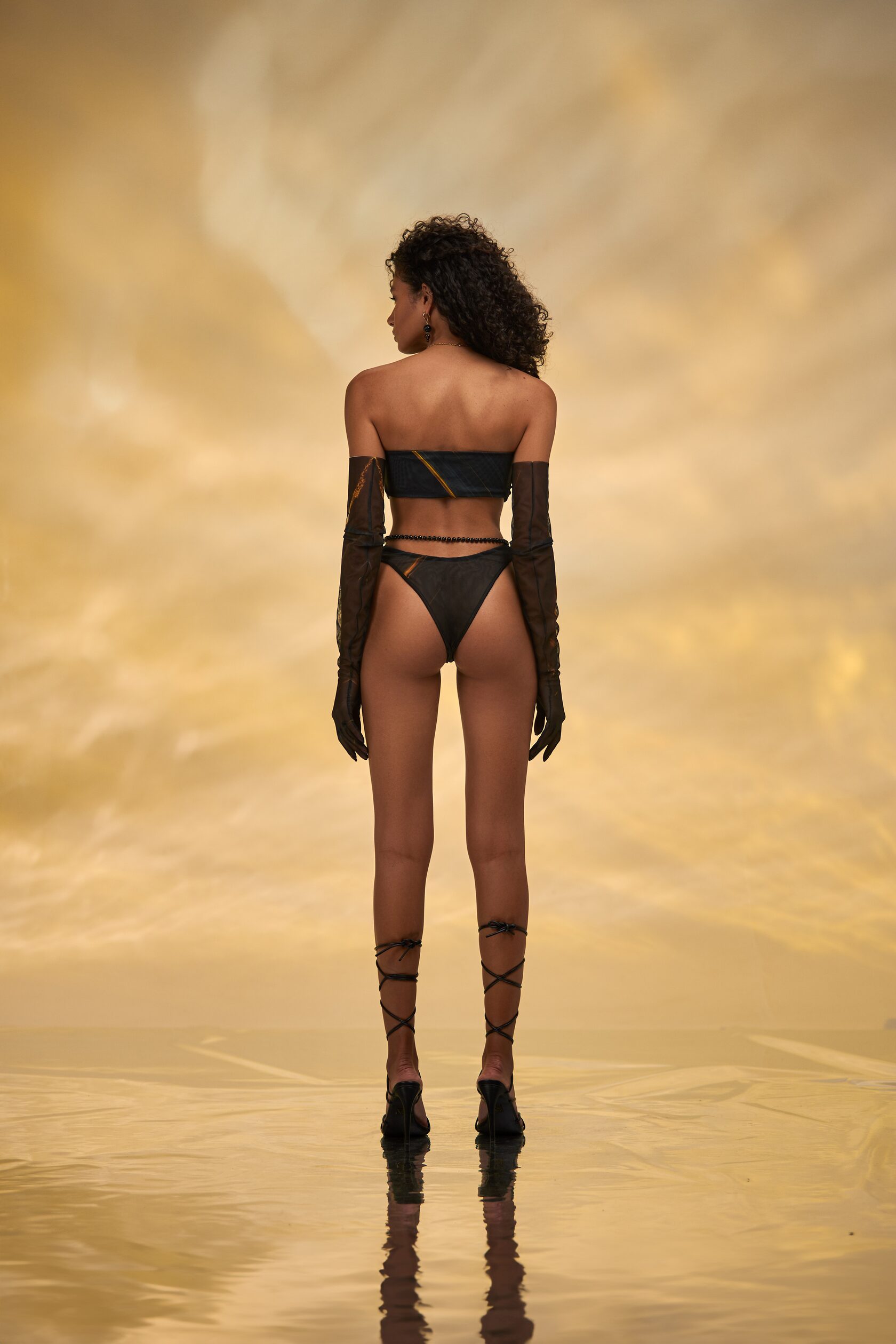 Hello, my name is Adele and I was created to emphasize your perfect figure. My bandeau top is gently held without ties, and my Brazilian trunks visually lengthen your legs.