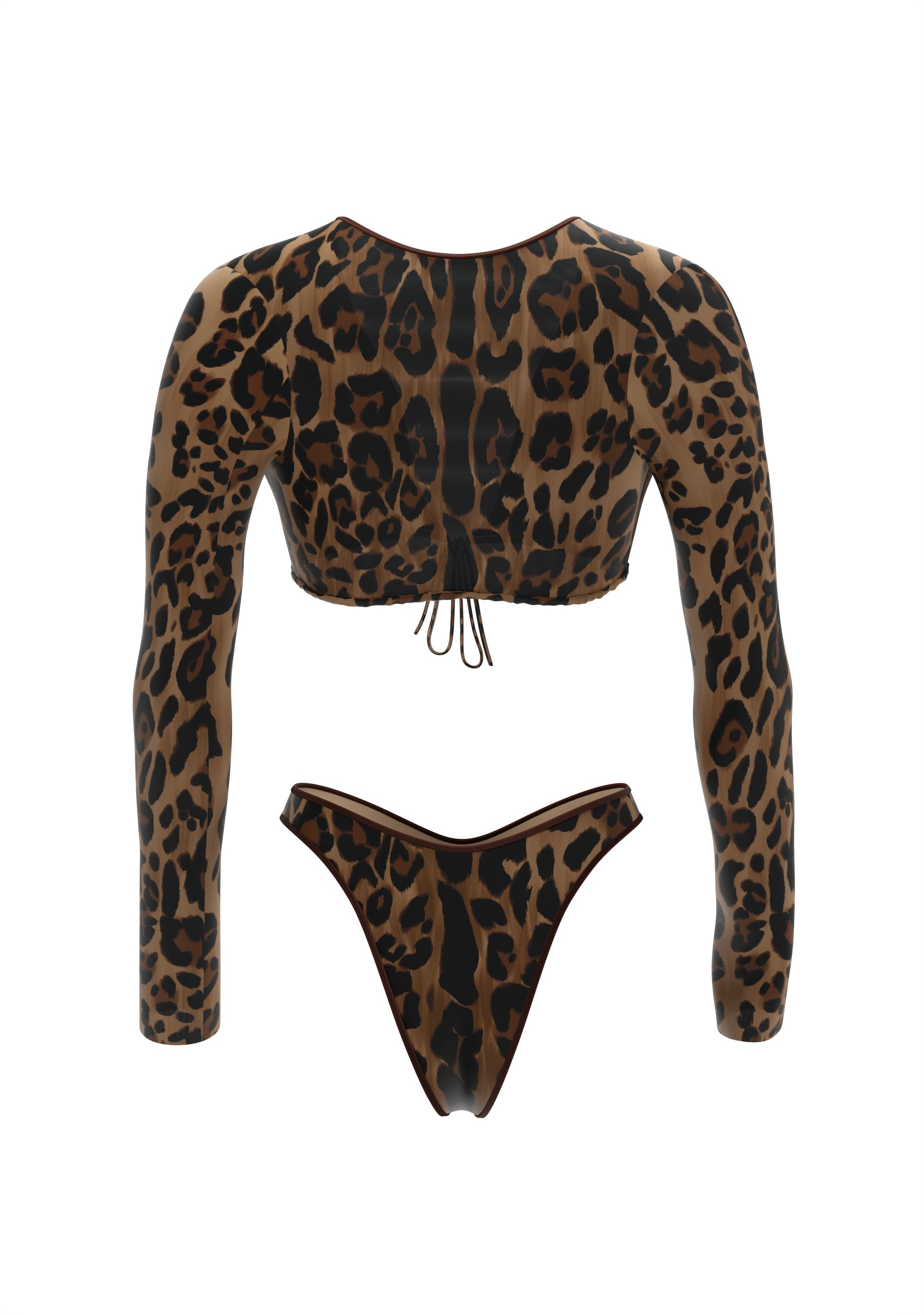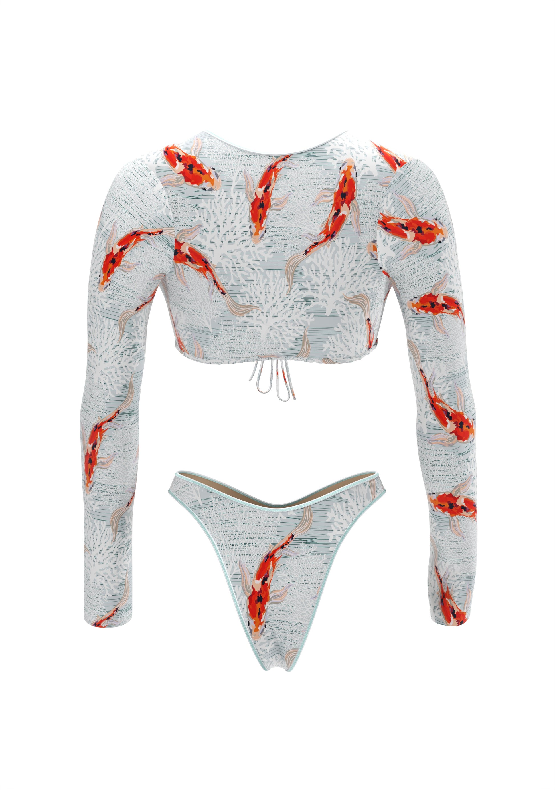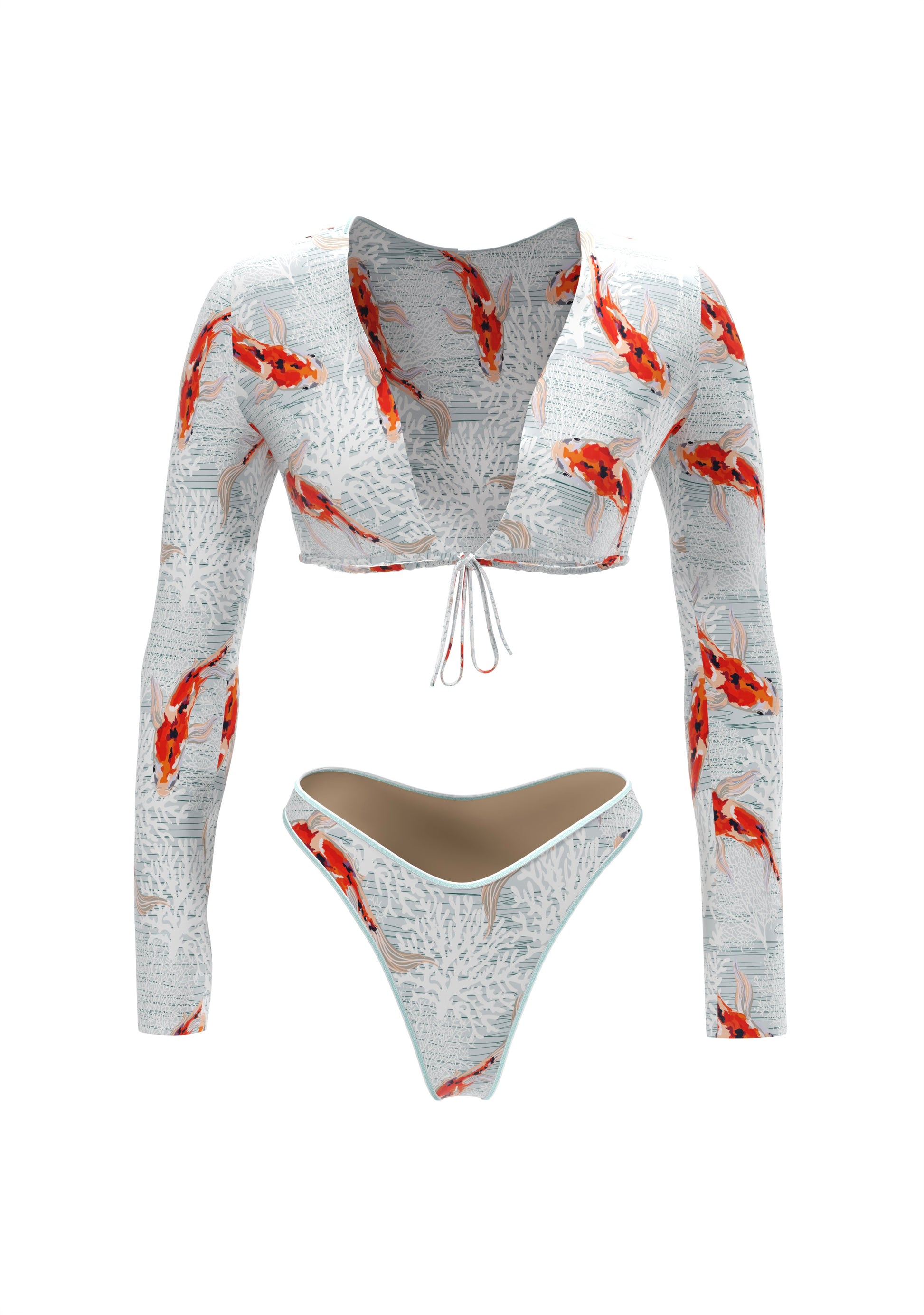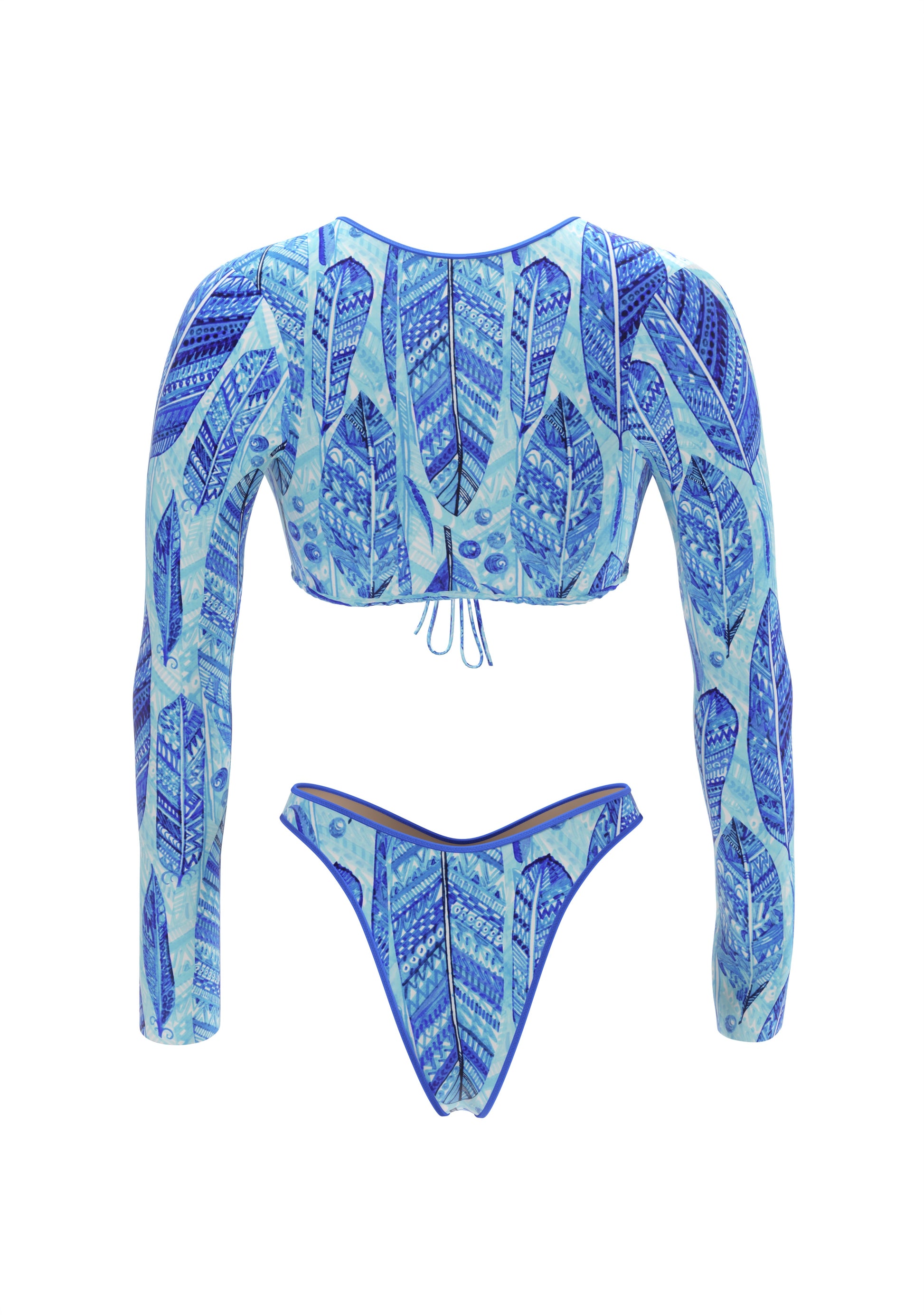 Hi, I'm Kim. I love to play with shapes and colors. My long-sleeved top with a tie under the bust looks stylish and at the same time reliably supports, while the high-waisted swimsuit emphasizes the waist and makes the silhouette even more expressive. I am created for those who value comfort and are not afraid to be bright. My design is easy to combine with jeans or shorts - and turn me into an element of an everyday look.